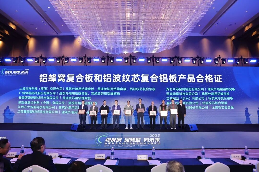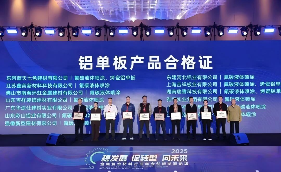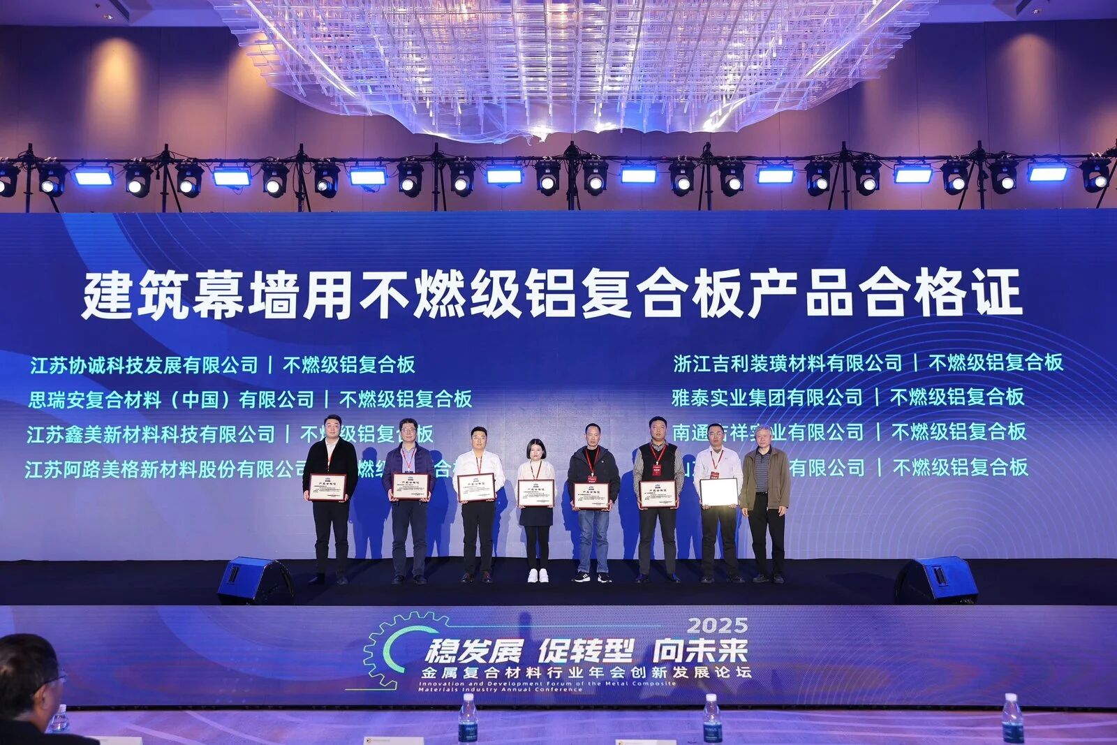 雅泰實業(yè)集團(tuán)參加本次年會,會上,集團(tuán)的氟碳液體噴涂鋁單板、不燃級鋁復(fù)合板、鋁波紋芯復(fù)合鋁板等產(chǎn)品分別榮獲“新國標(biāo),高質(zhì)量”產(chǎn)品合格證。