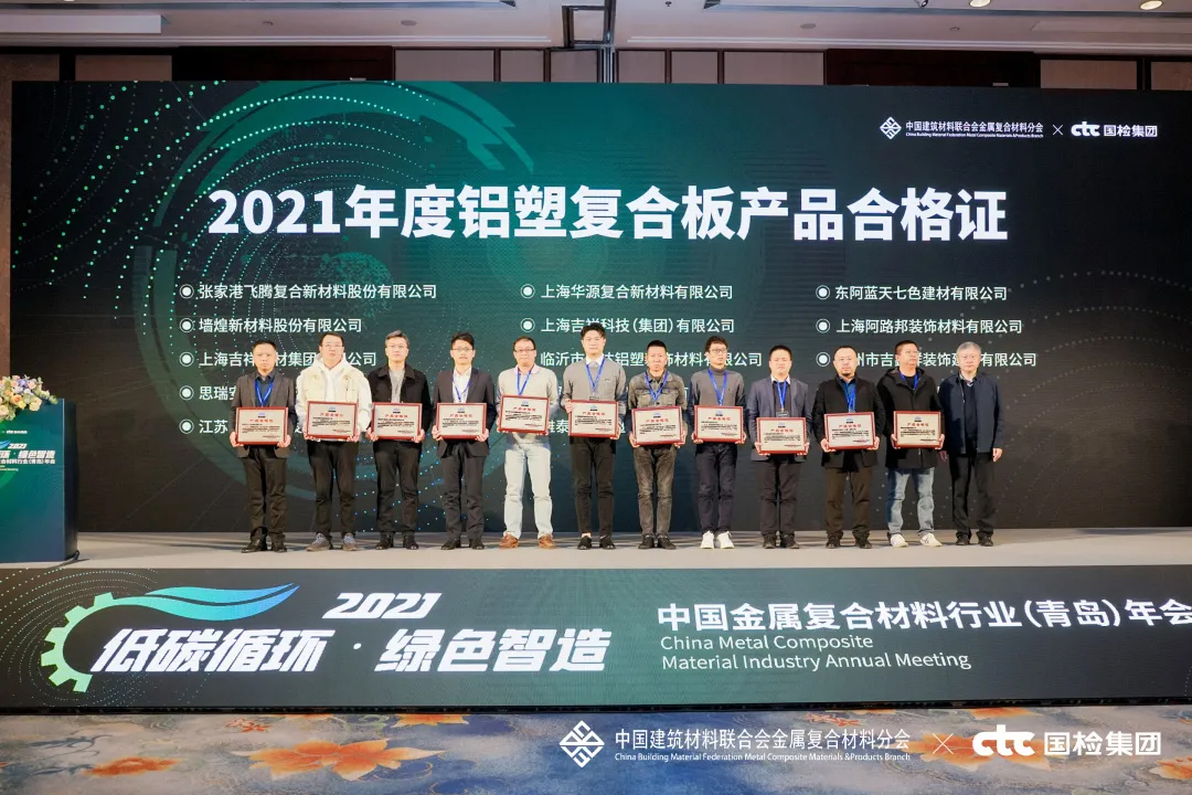 會(huì)上,對(duì)2021年度行業(yè)優(yōu)秀的產(chǎn)品與企業(yè)進(jìn)行了表彰頒獎(jiǎng)——雅泰 YARET 牌鋁塑復(fù)合板,于2018年至2021年期間經(jīng)中國(guó)建材檢驗(yàn)認(rèn)證集團(tuán)股份有限公司抽樣全項(xiàng)檢測(cè),產(chǎn)品質(zhì)量符合中華人民共和國(guó)國(guó)家標(biāo)準(zhǔn)(GB/T 17748-2016),榮獲2021年度CTC認(rèn)證產(chǎn)品合格證。