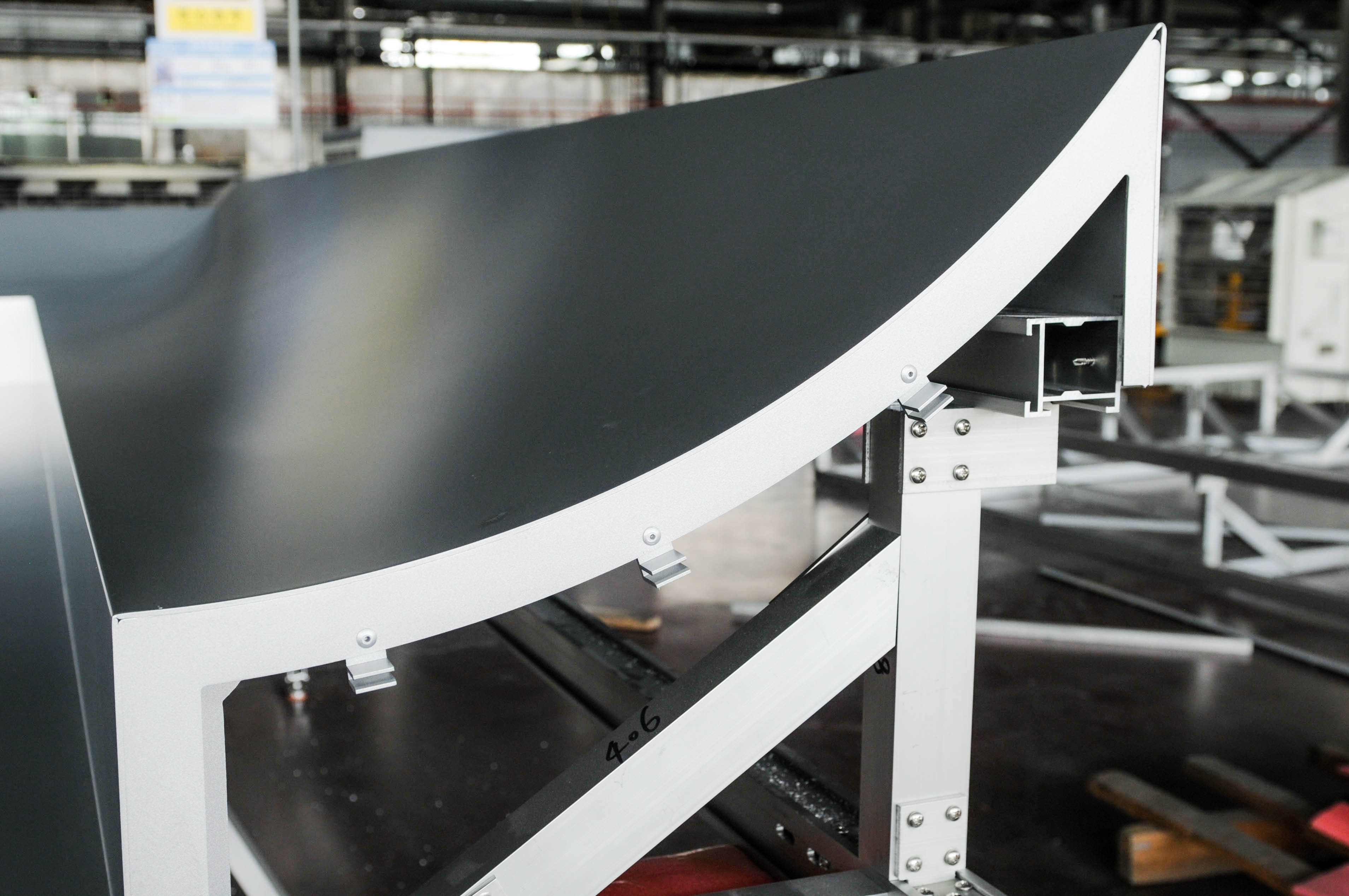 該項目是單元體幕墻結(jié)構(gòu),現(xiàn)場骨架與鋁板融為一體,鋁板組裝嚴絲合縫,單個單元體使用連接片160余個,其中60個需要機加工,以滿足三邊連接型材,個體螺絲使用量約1200顆。整體組裝后尺寸達到3000*5100mm。