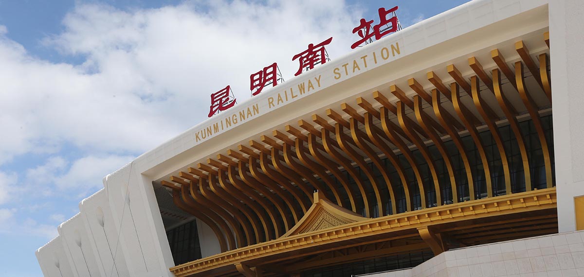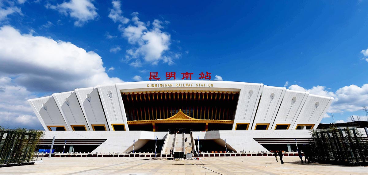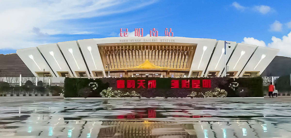 昆明南站(Kunming Nan Railway Station):位于云南省昆明市呈貢區(qū)吳家營(yíng)街道白龍?zhí)渡侥_之西,坐東向西,東邊是山區(qū),西距昆明市政府大樓約3公里、滇池約7公里,南面是西南聯(lián)大舊址和呈貢大學(xué)城,北距昆明站約28公里。正面造型為孔雀開(kāi)屏、鮮花綻放。