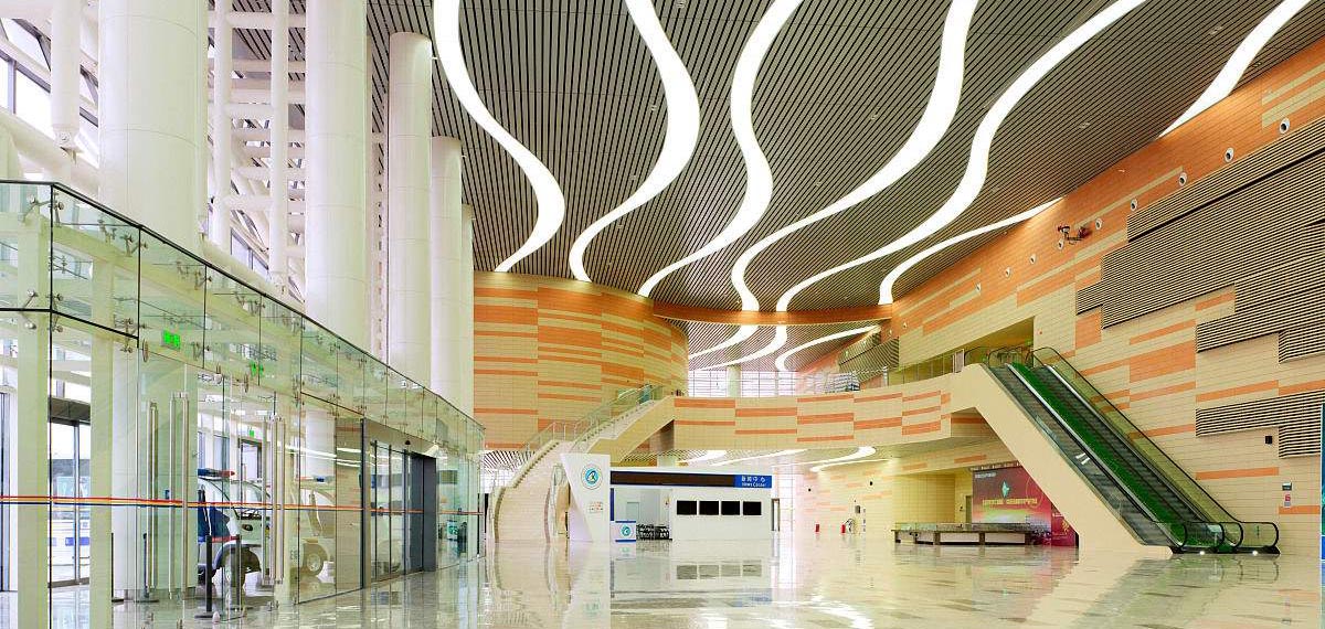新疆克拉瑪依會展中心,1期(20,000平方米)和2期(40,000平方米)。1期會展廳可以被分隔為兩個各5,5000平方米的廳,公共大堂和廣場是室內(nèi)的,以響應(yīng)克拉瑪依寒冬氣候和盛行風(fēng)。1期的主大堂特意被做成超大尺寸以允許舉辦額外的超大展覽或為了滿足多個展覽的登記工作;1期大堂也通過人行天橋與2期連接。一個能夠容納超過300人的會議區(qū)域被置于大堂的上一層。